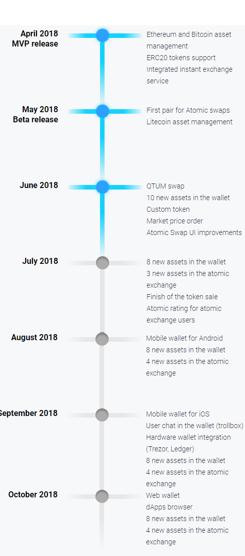 Проект проживает самую активную фазу своего развития в 2018 году. С начала года был выпущен релиз MVP и организованы управление активами Ethereum, Bitcoin и поддержка токенов стандарта ERC20. Затем была выпущена бета-версия проекта и поддержка Litecoin. К июню уже готов многоязычный интерфейс сайта, появились 26 новых токенов в кошельке и 4 в обменнике. Затем планомерно будут добавляться каждый месяц по 8 новых криптовалют в кошельке и 4 в обменнике. Параллельно, к концу 2018 года, появятся мобильные версии проекта для Android и iOS, пользовательский чат и браузер dApps.